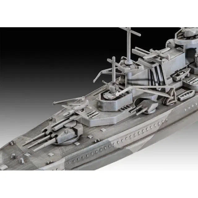 The model kit "Battleship Gneisenau" on a scale of 1:1200 is a tribute to the historic German warship of the Second World War. With a part count of 48 pieces, this kit offers an optimal balance between challenge and building pleasure. The finished model length of 188 mm, a width of 30 mm and a height of 60 mm make the model an impressive display piece. Designed for model building enthusiasts aged 12 and over, this kit is assigned to the Level 4 category, making it ideal for advanced modelers who have experience gluing and painting models.