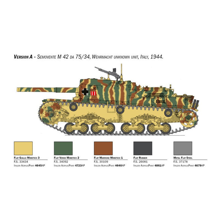 At the end of the 1930’s the Italian Regio Esercito (Royal Italian Army) began to deploy self-propelled artillery guns to provide support for tanks and infantry units. The ‘Semovente’ 75/18 was developed on the back of the ‘M’ series medium tank hull and soon became the most feared Italian armored vehicle. In addition to its primary artillery role, the 75mm howitzer installed in the casemate proved to be a highly effective anti-tank weapon, capable of destroying even the most powerful and heavily armored British and American tanks. During the war however, the Italian Regio Esercito requested the development of a version with increased offensive capability. The 75/34 cannon which was originally designed for an anti-tank role, was fitted to the hull of the M42 self-propelled tank. The initial units of which, were distributed to the Italian Army in the spring of 1943. As a result of its effective operational performance, it was also used by German anti-tank battalions after the armistice in September 1943.