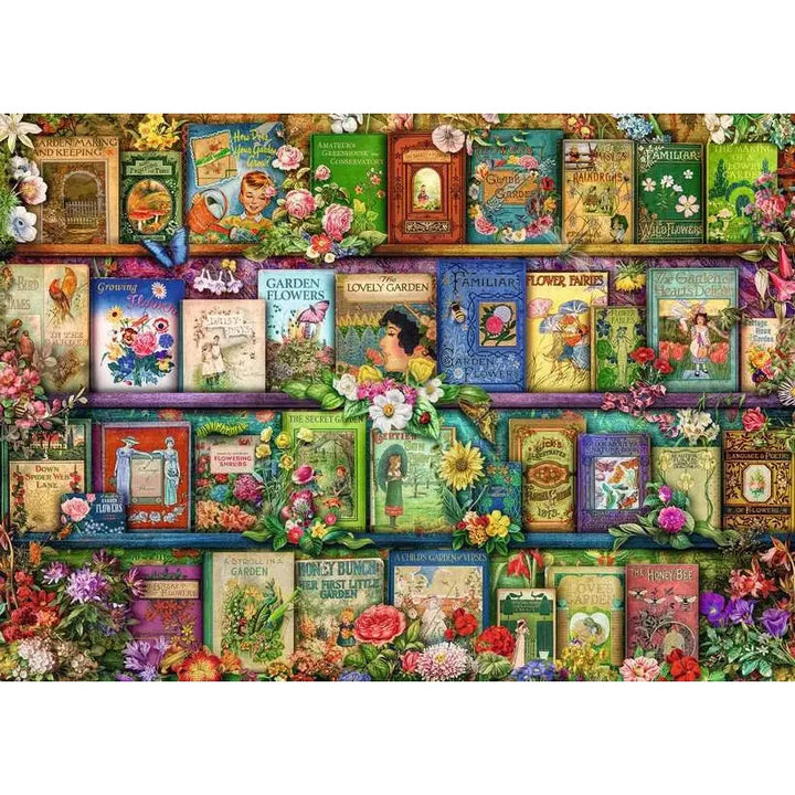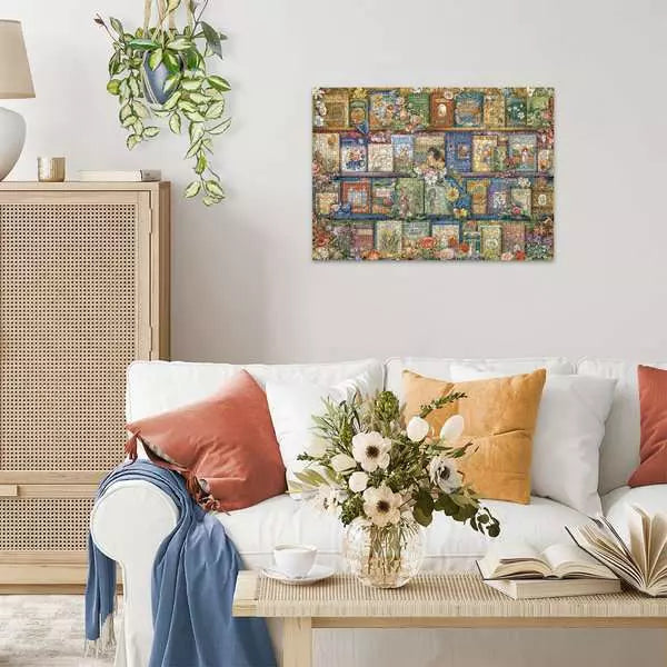 Take a break from your gardening tasks and discover this delightful collection of vintage books, some dating back over 100 years. The titles encompass many subjects, themes, tastes and age groups, each with an exquisite cover and charming illustrations. Our pretty bookcase is surrounded by garlands and posies of lovely flowers, their blooms attracting attention from visiting insects. Explore and enjoy the colours, titles and details of this charming library. Relax, unwind and create some mindful moments as you assemble this heavenly jigsaw puzzle. Includes full colour in-box leaflet with extra puzzle picture for easy reference and artist information.