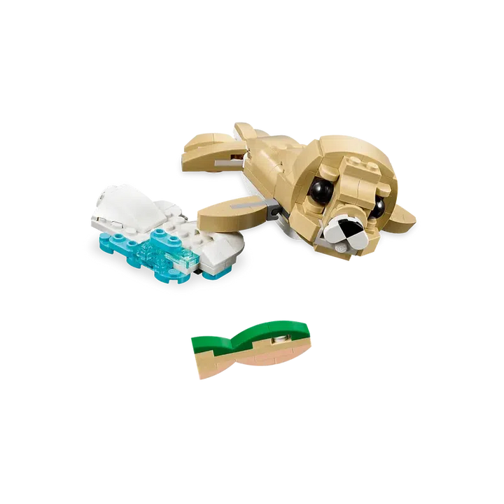 Girls and boys can build 3 different LEGO animal playsets with the same bricks: a posable Cute Bunny figure with a sunflower and a carrot, a posable llama toy with a patch of green grass and half a carrot, and a seal figure with a sheet of ice and a fish. All 3 scenes make a great gift for kids for imaginative play and display.
