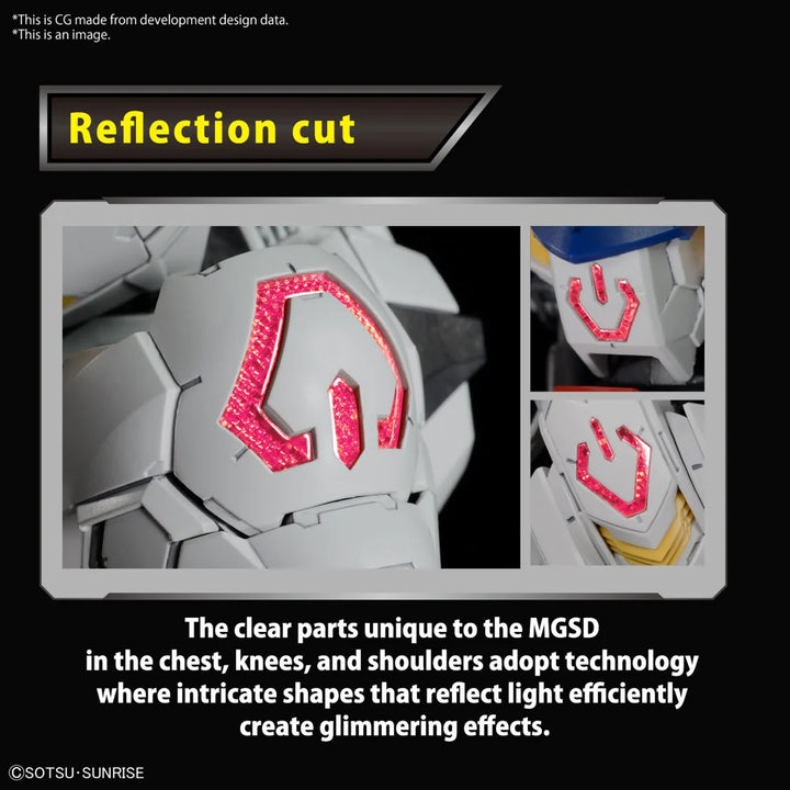 - MGSD original clear parts with precision-shaped processing, designed to efficiently reflect light, are employed on the chest, knees, and shoulders, introducing a shining technique.